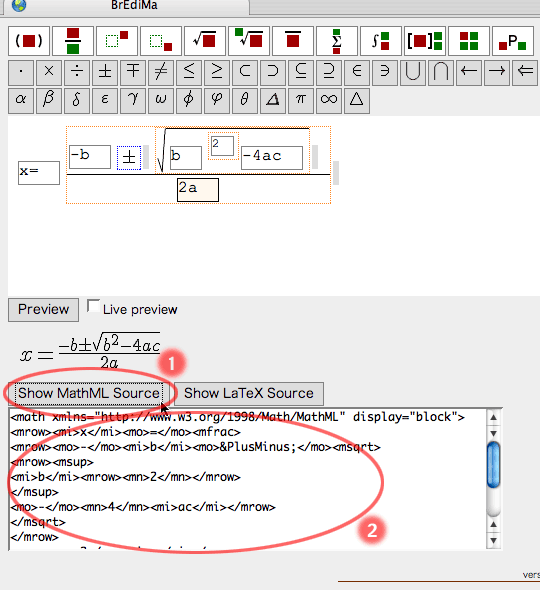 The source output of the current expression can be presented in MathML or LaTeX. Push the corresponding button to obtain the output in the textarea.